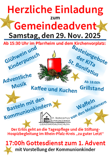 Mittwoch, 05.11.2025 Uhrzeit: 08:30 - 09:00 Limburgerhof Kirche St. Bonifatius, Limburgherhofkfd-Gemeinschaftsmesse